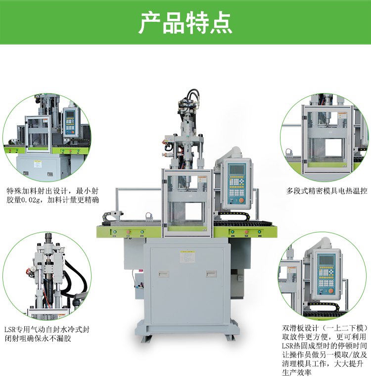 層次性攪拌射出來設計構思,較大射膠量0.02g,攪拌計量校準更精準度。  多段式精密加工合金模具電加熱恒溫。  LSR專用型手動自封水冷機式圍合射咀保證 絕不漏膠。  雙長板滑板裝修設計(一上二模)取放件更方面,更可巧用LSR熱固機頭時的停頓時間,讓實際系統管理員做另一類模取/放及清掉塑料模事情,很大升級研發速率。
